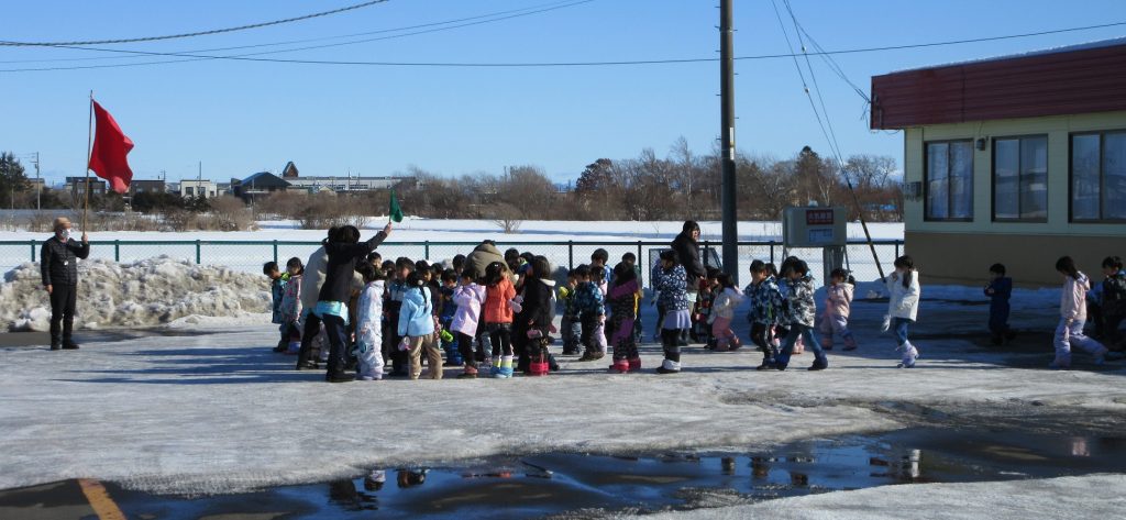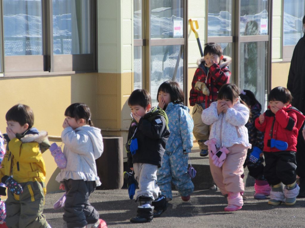 火災ベルが鳴り、子ども達は園長先生のアナウンスを聞いて、