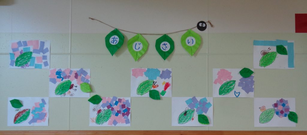 紙にアジサイの花を糊付けしてステキな絵