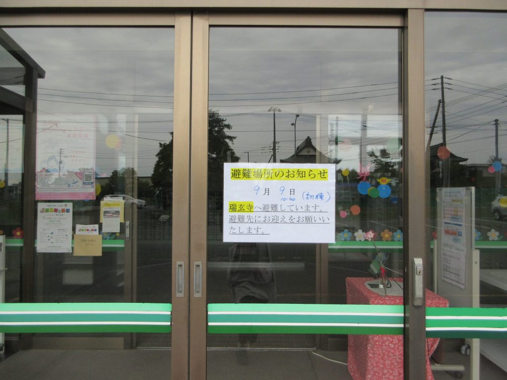 玄関には、避難先を掲示してお知らせして