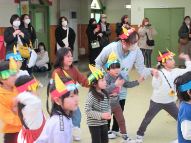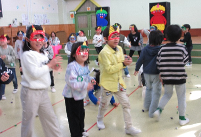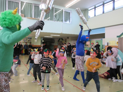 学年ごとにホールに集まり、教頭先生から節分の由来の話を静かに聞き、