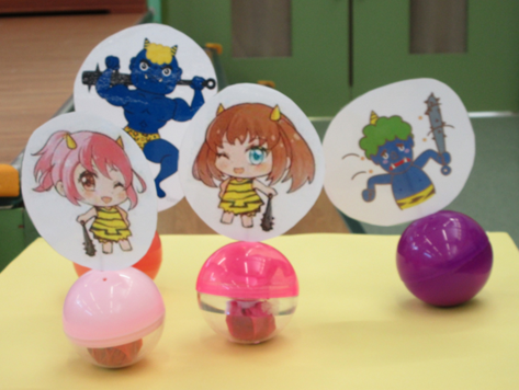 先週の設定保育(制作)では、工夫の凝らした鬼のお面と豆の代わりに、
