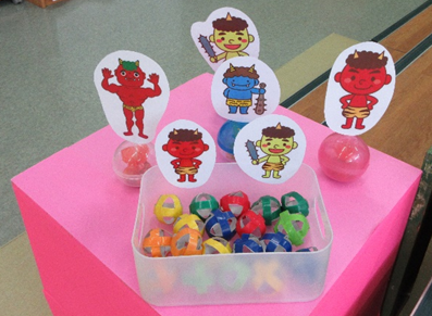 クラスカラーの折り紙を丸めて作り、今日の豆まきを迎えました。